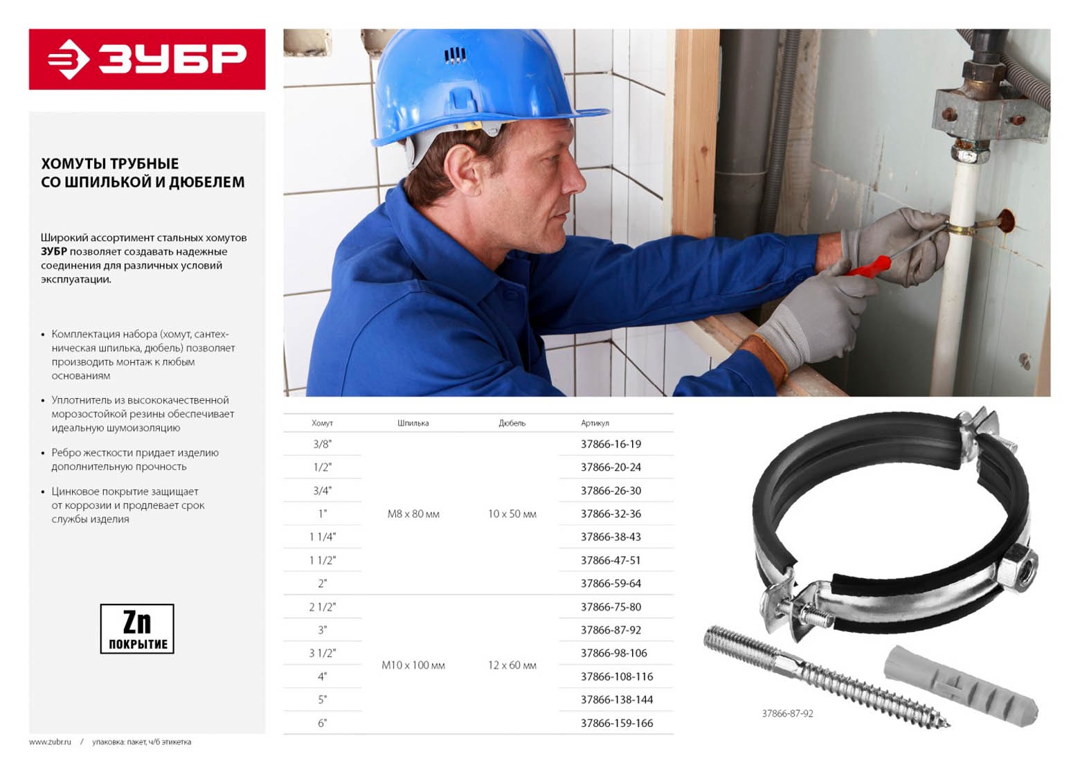 Комплектация | Хомут трубный 6" - 1 шт. Сантехническая шпилька М10х100 мм - 1 шт. Дюбель 12х60 мм - 1 шт. |